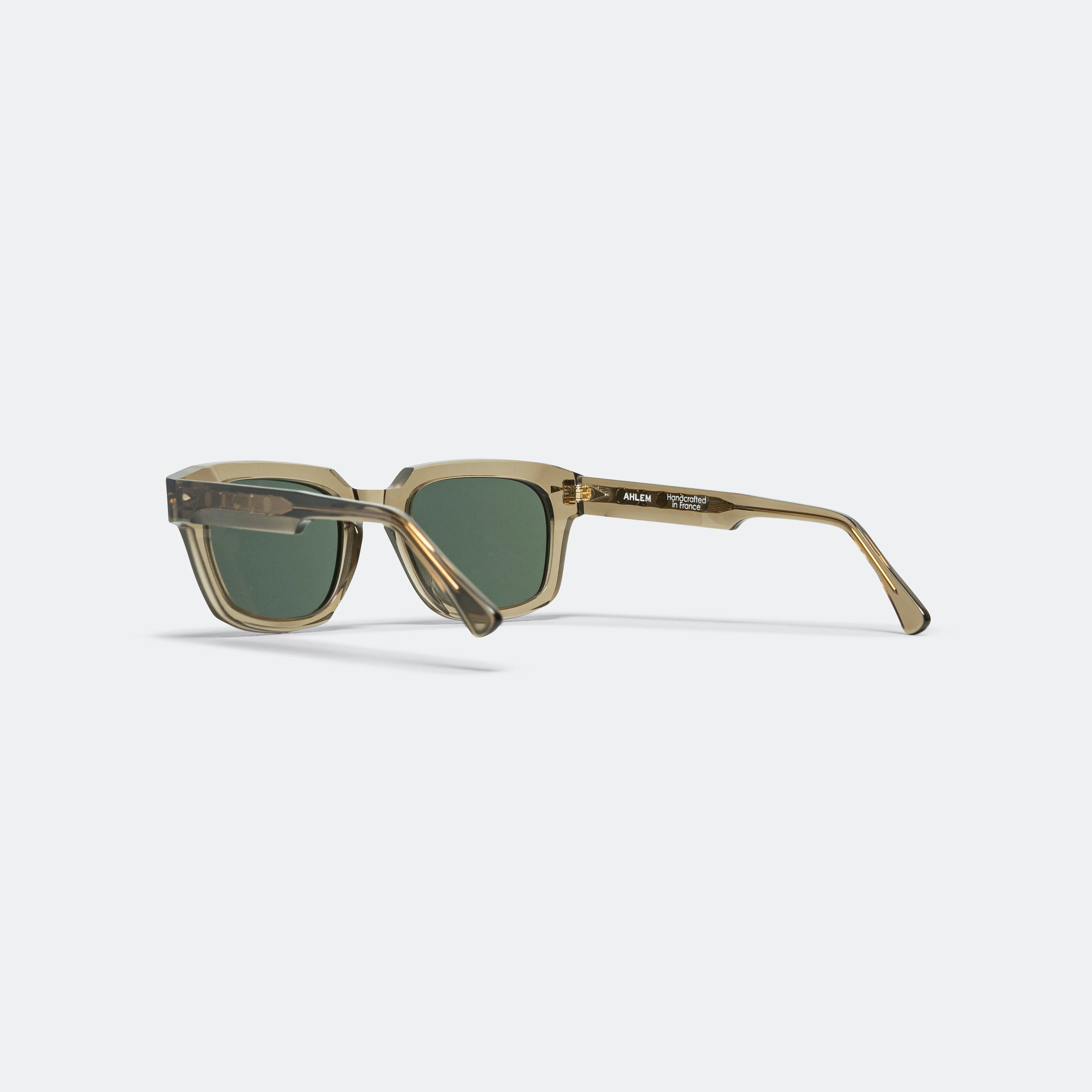 The sharp cuts across the brow create a stark contrast to the softer curves around the lenses. A bevelled edge also runs along the brow, complimented by the sculpted shape of the arms as them sweep back over the ears. The custom metal core of the arms are on full display within the lightly smoked grey acetate, secured with AHLEM's signature bauhaus triangle pins and five barrel hinges.