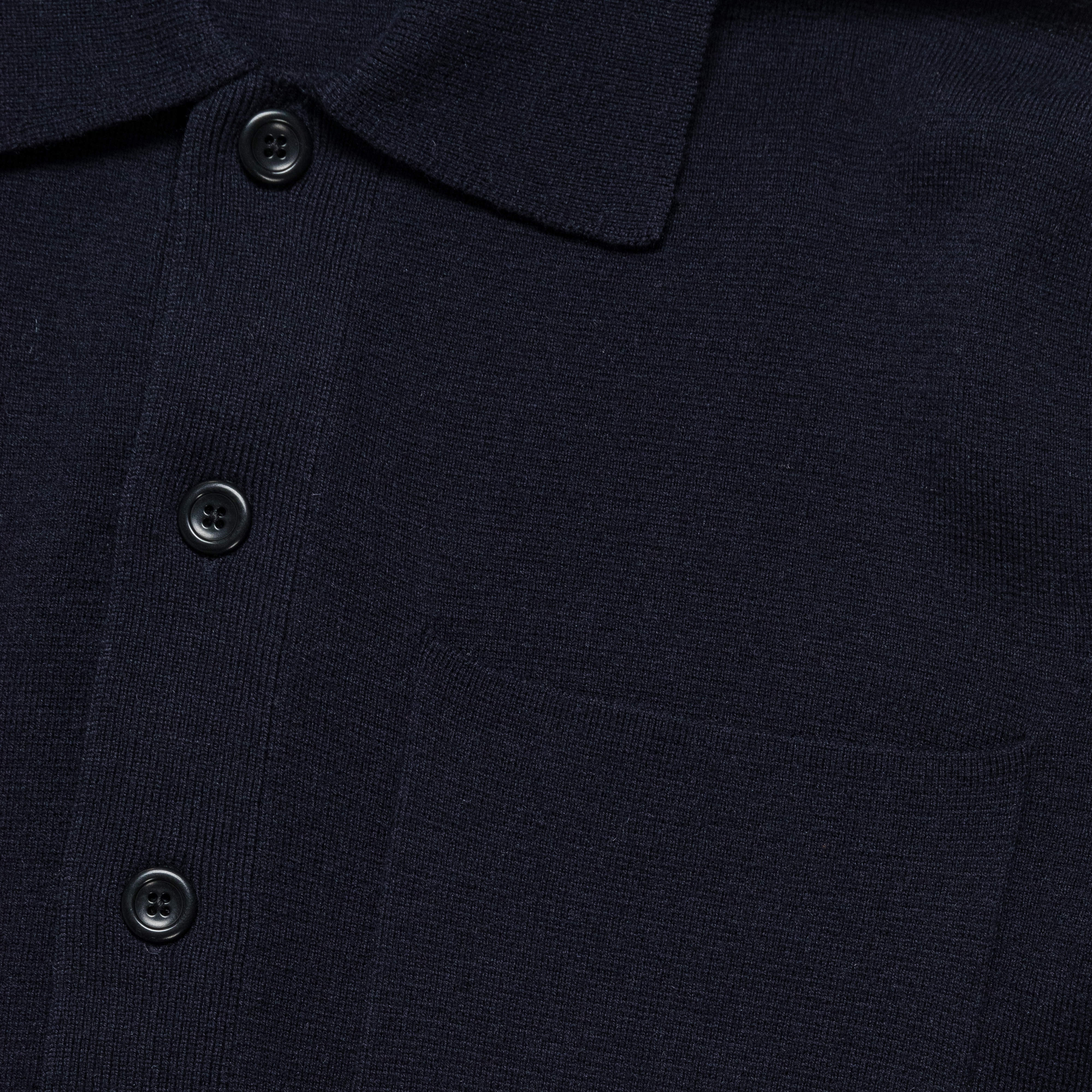 Long sleeve, single breast pocket, longer style, three button placket and knitted collar, tuck into some pleated trousers and tap into your best mid-century version of yourself.